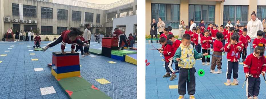 此次运动会按年级组分别进行,紧紧围绕幼儿体能发展这一核心目标。家长们现场观摩了 “跳马伕”“足球宝贝”“我和我的小旗” 等活力四射的早操表演,以及各班丰富多彩的民间体育游戏。孩子们在与竹竿、铁环、陀螺、高跷、空竹、毽子等传统器材的亲密互动中,尽情体味着游戏的趣味,不仅增强了体质,还传承了传统技艺,赢得了家长们的一致赞誉。小中班更是结合特色器材开展了亲子游戏,家长和孩子们齐心协力认真完成每一项运动项目,整个场地都洋溢着家长和孩子们的欢声笑语。