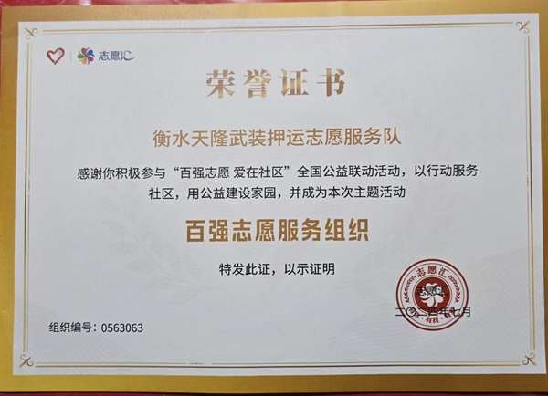 衡水天隆武装押运志愿服务队自2023年3月成立以来以在招待处第十党支部的正确领导下,以“行善心、做善事、感动身边人”为宗旨,累计开展公益活动120余次,服务范围覆盖福利机构、生态环保、老年关怀等多个领域,以实际行动弘扬“奉献、友爱、互助、进步”的志愿精神,成为衡水市企业志愿服务的标杆力量。