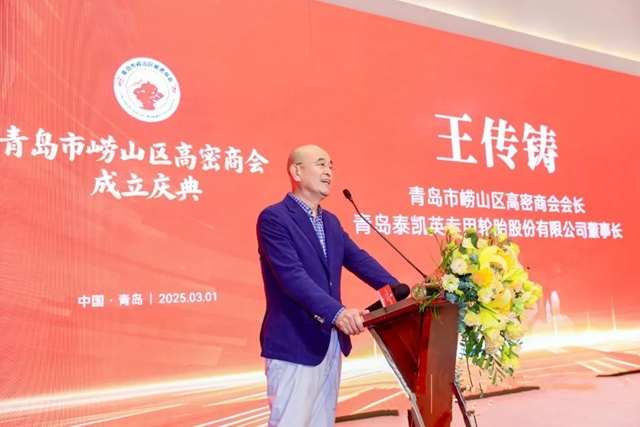 当选商会会长、青岛泰凯英专用轮胎股份有限公司董事长王传铸作就职发言。他表示,青岛市崂山区高密商会将坚持务实、真诚、团结、成长的文化理念,充分发挥连接高密与崂山、连接企业与政府、连接会员与会员的桥梁纽带作用,积极搭建交流合作平台,助力会员企业把握机遇、加快发展,为两地经济社会高质量发展贡献智慧和力量。