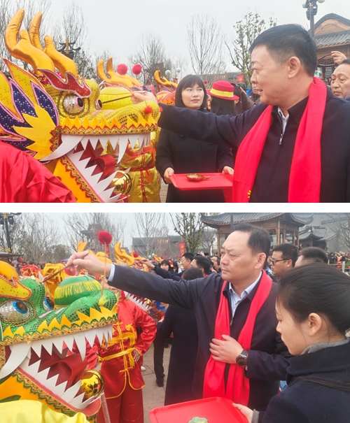 点睛嘉宾钟马、王海浪、胡长荣、金志庚、吴开军、蒋雪峰、蔡峦、余淑琴、张玉成用金笔蘸满朱砂,跟着《点睛吉语》一起举行“龙眼点睛”仪式。朱砂左点祥龙眼(点左眼),推动经济大发展。朱砂右点祥龙睛(点右眼),淮台人民一条心。朱砂中点龙天灵(点龙天灵),预祝中华盛世永太平。