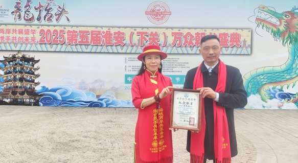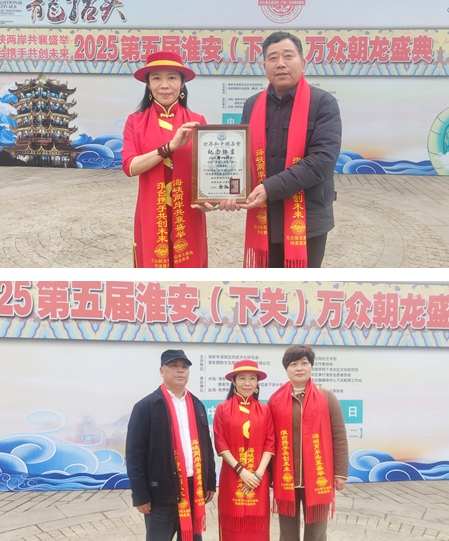 心念两岸,巧斧伐名木。情系同胞,巧匠雕龙船。为精心筹备万众朝龙盛典,促进淮台民间交流,增强淮台同胞友谊。淮安市巧斧家居有限公司董事长、2025第五届淮安(下关)万众朝龙盛典组委会副主任吕万红,精选缅甸上等红木,精挑能工巧匠,精雕一艘精致的《一帆风顺》的名贵龙船,船上题刻“共创中华民族绵长福祉,共享民族复兴伟大荣光”,特赠予台湾·世界和平亲善会理事长余淑琴女士,祝福两岸同胞事业、友谊一帆风顺。