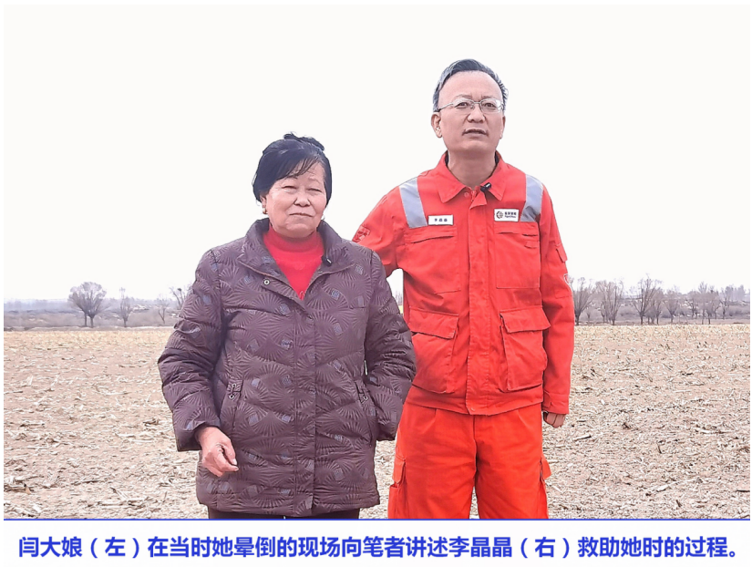 闫大娘名叫闫世芳,是陕西省榆林市榆阳区元大滩村的一位普通村民,与老伴李仲有靠种地为生。回忆起李晶晶对她的救助,闫大娘至今都记忆犹新。2019年4月的春耕农忙时节,闫大娘在自家地里劳作时,突然心跳急促、呼吸困难,晕倒在地,无法起身。就在这时,一个身影跑了过来,他就是巡线路过这里正好看到这一幕的李晶晶。