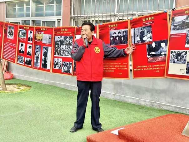 会长侯志龙身着红马甲携带自制的展板在园内广场举办“永远的传承”雷锋事迹图片展。为天真烂漫的孩子们带来一场别开生面的雷锋精神教育,旨在将雷锋精神的种子播撒在幼小的心灵之中,传承这份温暖与奉献的力量。
