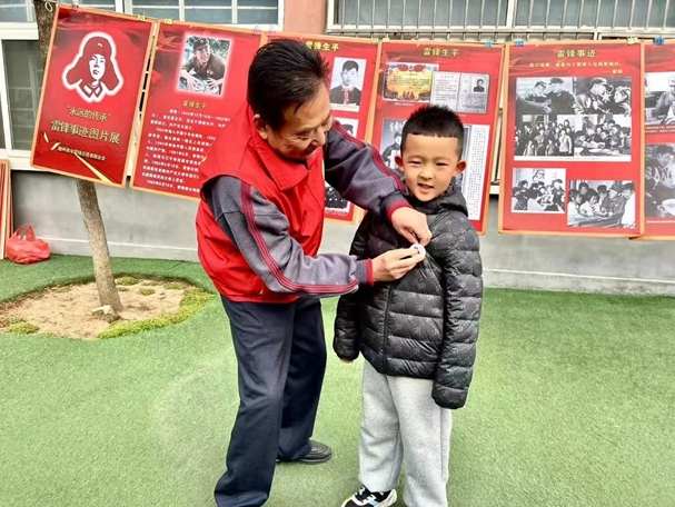 “小朋友们,你们知道雷锋叔叔是做什么的吗?”会长侯志龙用提问的方式与孩子们进行互动交流,激发孩子们的求知欲,孩子们纷纷举手,争相回答,侯志龙为孩子们佩戴雷锋像章。当孩子们戴上雷锋像章时满面笑容,高兴无比,感到无比骄傲和自豪。