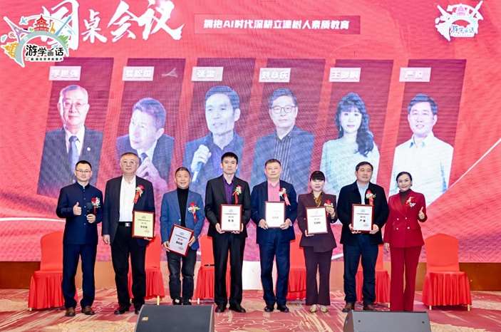 AI智慧圆桌会谈环节,中国国际教育电视台李世强台长、深圳大学易松国教授、中国政法大学张雷教授、知名战略学家刘章庆博士、大智慧心里学创始人王御桐博士、江西研学旅行研究会执行会长严俊会长等多位资深专家齐聚一堂,围绕AI与素质教育的融合展开深入探讨。他们从不同专业角度出发,分享了各自的见解与经验,就AI技术在教学方法创新、教育资源优化配置、个性化教育实现等方面的应用前景进行了热烈讨论,为行业发展提供了诸多具有前瞻性和建设性的思路。会谈结束后,肖方方董事长为各位嘉宾授牌,感谢他们为教育事业贡献的智慧与力量。