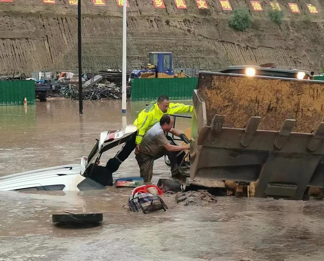7月11日上午,庆阳市环县又遇暴雨倾袭,211国道山城段一处公路被山洪淹没,一辆重型半挂牵引车和一辆小轿车被困洪水中,山城交警中队中队长常睿不顾个人安危,开着铲车冲进洪水中,架起被困车辆安全桥,成功将3名被困人员救出。