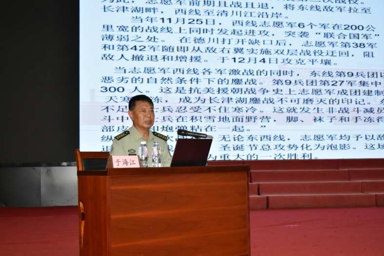 授课过程中,于海江以“承弘扬伟大的抗美援朝精神、努力提高打赢本领”为主题,就抗美援朝战争的背景、重大战役、抗美援朝精神的重大意义、牢记使命锻造军人意志等方面进行了深入浅出的讲解,并结合自身家庭背景和军旅经历,将国家和个人命运的紧密联系娓娓道来,通过朴实的话语和真实的经历,将先辈们抗美援朝的伟大历史意义和当代官兵强国强军的重要历史责任紧密的结合起来,引发了现场听课官兵的强烈共鸣。