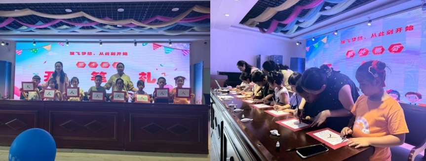 入学仪式的核心环节,是充满传统文化韵味的 “朱砂启智” 与 “开笔礼”,在庄重的仪式感中,孩子们悄然读懂学习的意义,触摸传统的温度。“‘痣’通‘智’,点上朱砂痣,祝愿大家眼明心亮,好读书,读好书!” 主持人的讲解刚落,缪校长、张校长、缪主任便手持朱砂,小心翼翼地为每一位一年级学童,在额头正中点上一颗鲜红的痣。这抹鲜红,像一颗小小的启智种子,在孩子们心中悄悄扎根;也让他们在与传统的对话中,读懂 “学习” 二字的重量。随后的 “开笔礼” 上,一年级语文教师代表张培凤老师走上台前,她一边示范书写 “人” 字,一边轻声讲解:“一撇要有力,一捺要稳健,做人就要像‘人’字一样,相互帮助、脚踏实地。” 几位新生代表勇敢地走上台,握着笔写下歪歪扭扭却无比认真的 “人” 字,这一撇一捺,不仅是书写的开始,更是孩子们 “学做人、立品格” 的启蒙第一课。