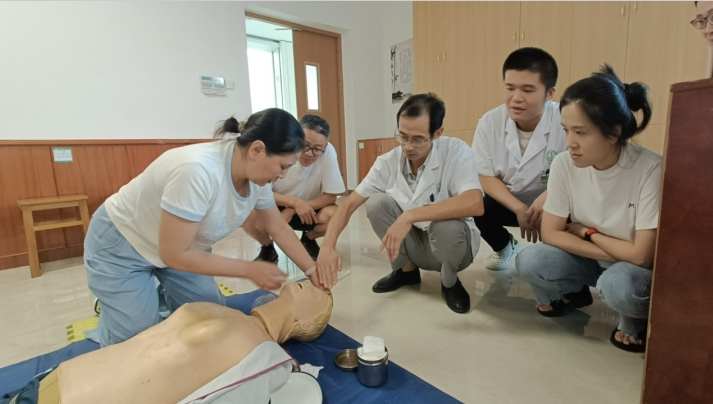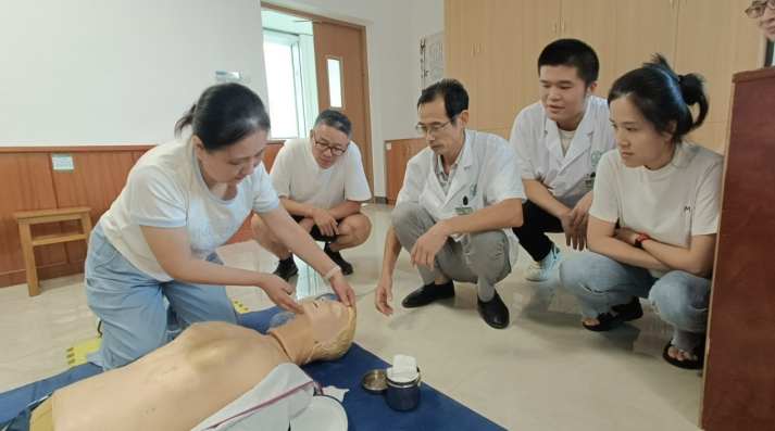 参训人员热情高涨,积极参与实操练习。无论是每天与患者密切接触的临床医护人员,还是负责行政、后勤事务的工作人员,都认真跟随老师的指导反复练习,主动请教操作中遇到的问题。老师们则一对一进行指导纠正,及时调整参训人员的动作偏差,确保大家都能熟练掌握规范的心肺复苏操作技能。