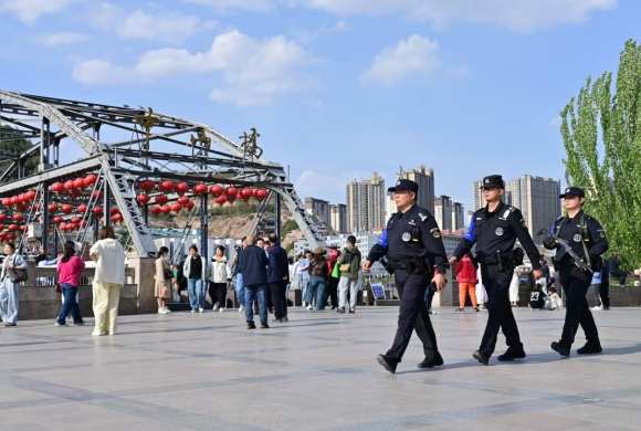 “请大家不要拥挤,扶好两侧的栏杆,有序通过……”“拍照的游客,请注意安全,不要进入河水浅滩……”,兰州市公安局城关分局第三治安派出所中山桥警务站民辅警,坚持显性用警、动中备勤,采用车巡、步巡、警航无人机巡等方式,织密立体治安防控网,严格落实“1、3、5”分钟快反机制,实行24小时不间断、动态化巡控,持续提升核心景区见警率、管事率、服务率。同时,联合相关行政部门开展执法检查,严厉打击制售假冒伪劣商品、非法经营、敲诈勒索、强迫交易等涉旅违法犯罪,重点整治黑三轮、黑出租、黑导游、黑旅社等涉旅乱象,坚决维护游客合法权益、守护金城旅游良好形象。
