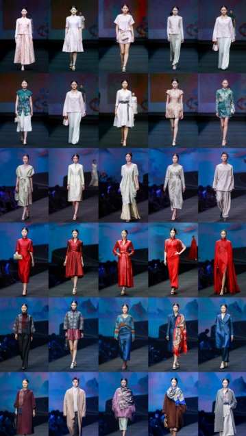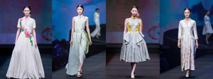 《初心·立春》篇章以纯净白为基底,辅以淡雅粉彩晕染,一袭简约白裙拉开发布会序幕,精准呼应青春年华的创意萌芽与初心坚守。任清君校友在分享中提及,求学期间的设计创作,正是在贴合市场需求的实践中,始终坚守创意本真的宝贵历程;《探索·夏竹》篇章以“竹”为设计内核,寓意“向光而生”的成长力量,服装剪裁从柔韧到挺括、廓形从宽松到立体的层层递进,具象化呈现了设计师在职业探索阶段的坚韧执着与突破创新;《繁华·秋华》篇章尽显岁月沉淀的文化厚重,传统纹样的深邃韵味在面料底色中晕染开来,宋锦、壮锦的华美质感随模特步履流转,西湖印象、饕餮纹样、梅兰竹菊、卷枝纹等经典元素凝练为宝相花的圆满意象,深刻诠释了传统文化赋予服装的精神内涵;《归真·冬藏》篇章以水墨意境为基调,主打松弛廓形与自然色彩,在“拥有”与“放下”的平衡中诠释设计本真,展现了设计师历经行业淬炼后的从容气度与智慧沉淀。