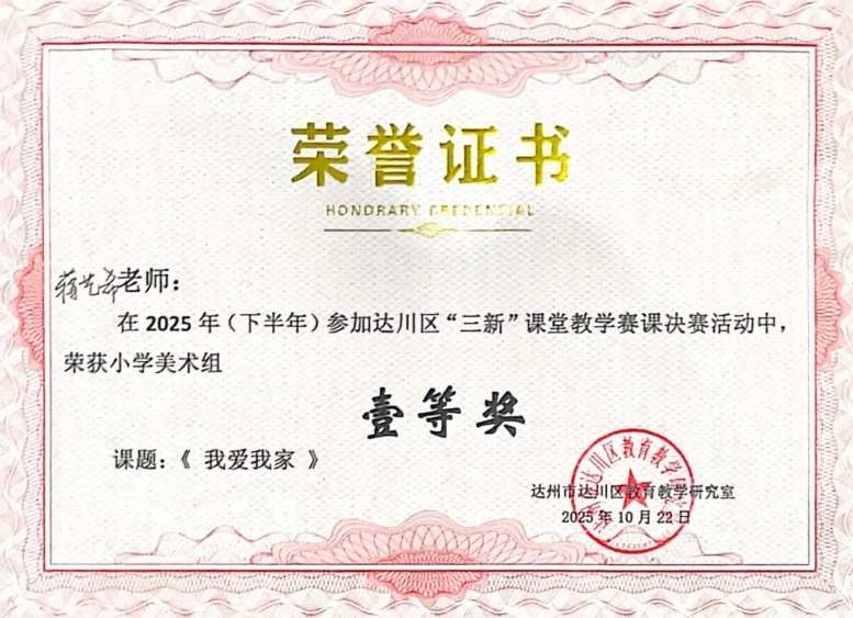 本网四川达州讯(杜靖宇 观理 报道)秋兰飘香,硕果盈枝。在10月21-22日开展的达川区2025年小学美术“新课程·新课标·新教材”课堂教学赛课活动中,达川区逸夫小学蒋艺希老师凭借其精湛的教学技艺和独特的课堂魅力,在众多优秀选手中脱颖而出,荣获一等奖!