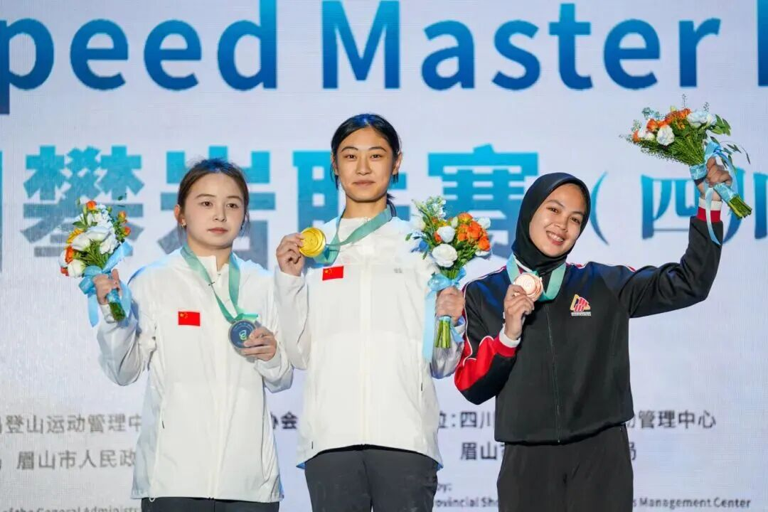 青岛市城阳区运动员王雨婷(中)国际攀岩速度大师赛女子速度赛冠军领奖照片