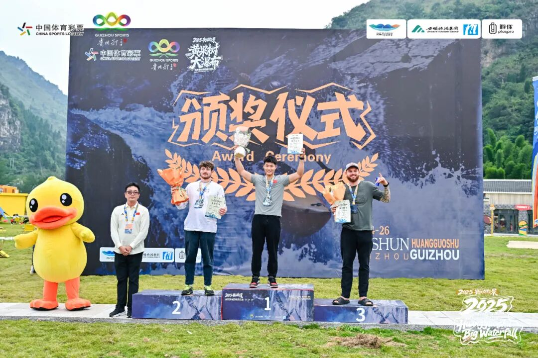 青岛市城阳区运动员王思尧(右二)国际激流回旋极限赛男子极限皮艇长距离冠军领奖照片