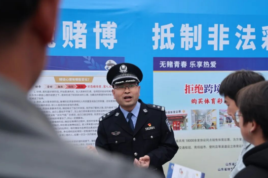 本网青岛讯 (通讯员 鲍鸿飞)为贯彻落实山东省厅相公安关部署,常态化开展打击治理跨境赌博宣传工作,提升广大人民群众对跨境赌博严重危害的认识。10月26日,青岛市公安局携手青岛市体育局、青岛市体彩中心在西海岸大学城体育场利用中超比赛大型活动期间,开展“拒绝跨境赌博·抵制非法彩票”主题宣传活动。