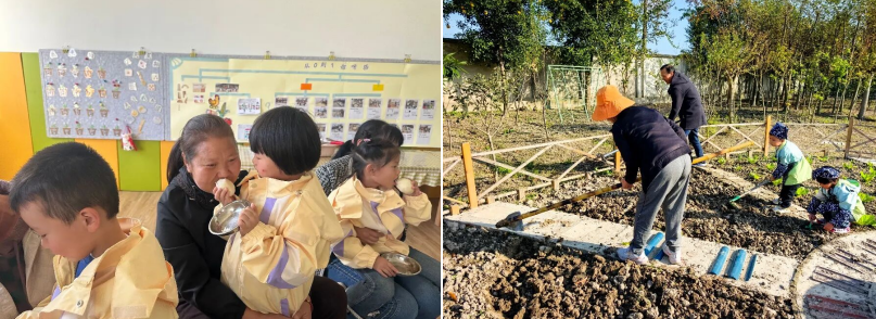中班的活动则把 “课堂” 搬到了户外田埂。秋日暖阳下,爷爷弯腰将土块敲碎,奶奶从布兜里捻出饱满麦种,手把手教孩子把种子撒进浅沟。“轻轻撒,别攥太紧,种子也要呼吸呢!” 奶奶的叮嘱伴着微风,孩子学样儿松开手指,看着麦种落入泥土。这播下的不仅是麦种,更是农耕文化里的陪伴与珍惜;而在 “祖辈忆粮情” 环节,爷爷讲起 “小时候用窝窝头充饥,一粒米都舍不得掉” 的故事,眼角泛起泪光,孩子们静静倾听,有的悄悄握住爷爷的手 —— 老一辈的艰苦岁月,成了最生动的 “节约教育课”。
