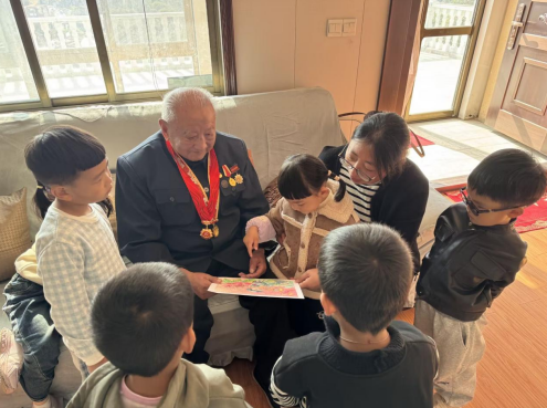 最让人动容的环节,莫过于 “童心访前辈”—— 中大班的幼儿代表化身 “小小祝福使者”,捧着提前画好的贺卡、扎好的纸花,蹦蹦跳跳地来到老革命陈金胜爷爷家中。一进门,孩子们便甜甜地围上来:“陈爷爷!重阳节快乐!” 稚嫩的声音瞬间暖了屋子。围坐在陈爷爷身边时,孩子们纷纷挺直小身板,睁着亮晶晶的眼睛,认真聆听爷爷讲述战火纷飞的岁月:“以前没有暖衣服,我们也得扛着枪保护家……” 听到动情处,有的孩子悄悄攥紧小拳头,有的轻轻帮爷爷理了理衣角,稚嫩的敬佩感在空气中悄然生长。