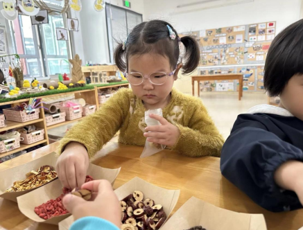 回到幼儿园,“巧手制礼” 的温暖场景随即展开:小班孩子用彩笔在贺卡上画歪歪扭扭的 “爱心”,还歪着脑袋问老师 “这样爷爷奶奶会喜欢吗”;中班孩子跟着老师一起称量糯米粉、按压模具,鼻尖萦绕着米香时,忍不住偷偷舔了舔沾着粉的小手;大班孩子则细致地挑选干菊花、分装枸杞,为爷爷奶奶制作养生茶包,再一针一线缝好驱蚊香囊 —— 每一个褶皱、每一颗装饰,都裹着 “想让长辈开心” 的小心意。