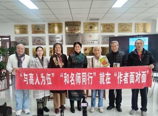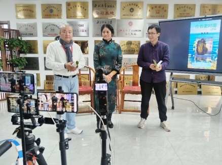 “天津杰出女诗人张秀华携诗集《花语》《诗海花趣》作客《作者面对面》直播公益平台”直播现场部分嘉宾合影。左起:柴金龙、李秋玫、于洪、张秀华、张九龄、老金(柳镇)、蔡诗华。(张恺 摄)
