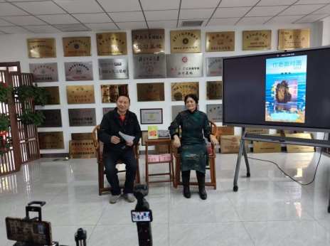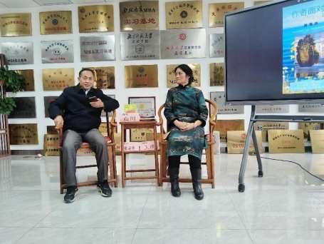 “战士诗人”蔡诗华(左)主持“天津杰出女诗人张秀华携诗集《花语》《诗海花趣》作客《作者面对面》”公益活动。( 张恺 摄)