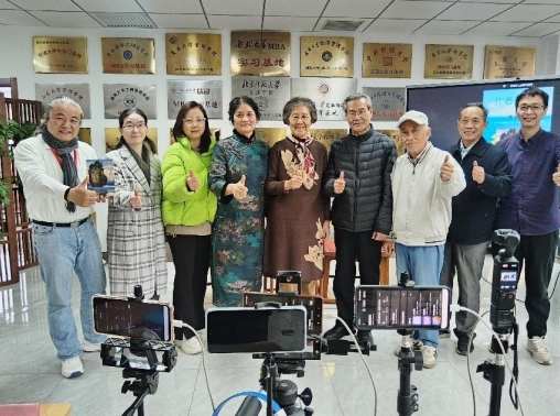 “天津杰出女诗人张秀华携诗集《花语》《诗海花趣》作客《作者面对面》直播公益平台”直播现场部分嘉宾合影。左起:柴金龙、李秋玫、徐焕、张秀华、于洪、老金(柳镇)、张九龄、山川、张恺。(蔡诗华 摄)