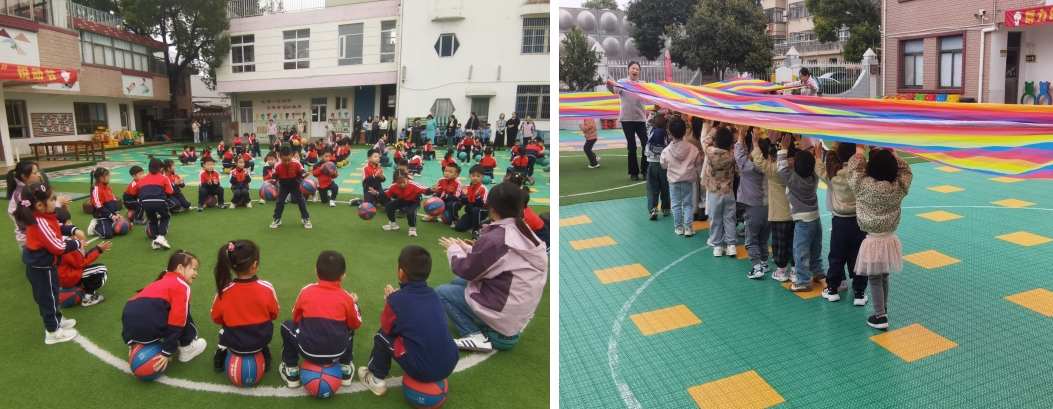 随后的早操展示环节,各年级组活力满满、特色鲜明。大班“篮球宝贝”动作利落,篮球在手中灵活跳跃,尽显阳光朝气;中班“勇敢的小乌龟”模拟小动物姿态,萌趣十足又不失力量感;小班“动物出游记”则以童趣情境串联动作,孩子们稚嫩的脸庞满是投入,赢得在场教师的阵阵掌声。