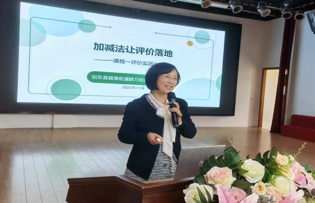 专题讲座环节,群力幼儿园副园长陈永红围绕《加减法让评价落地》展开分享,结合幼儿园“一课程一评价”实践案例,深入浅出地讲解如何通过“加法”丰富评价维度、“减法”简化评价流程,让评价真正服务于幼儿发展与课程优化,为参会教师提供了可借鉴、可操作的评价实施路径。