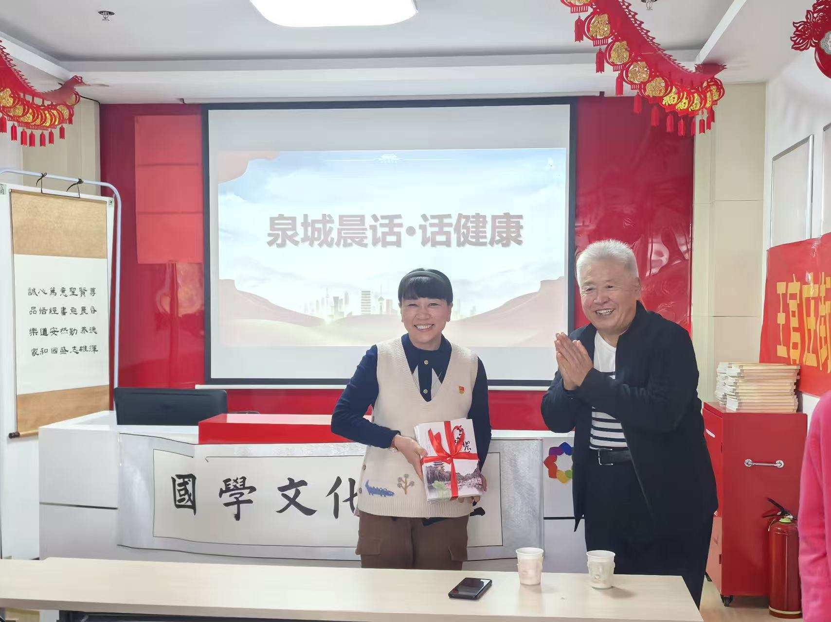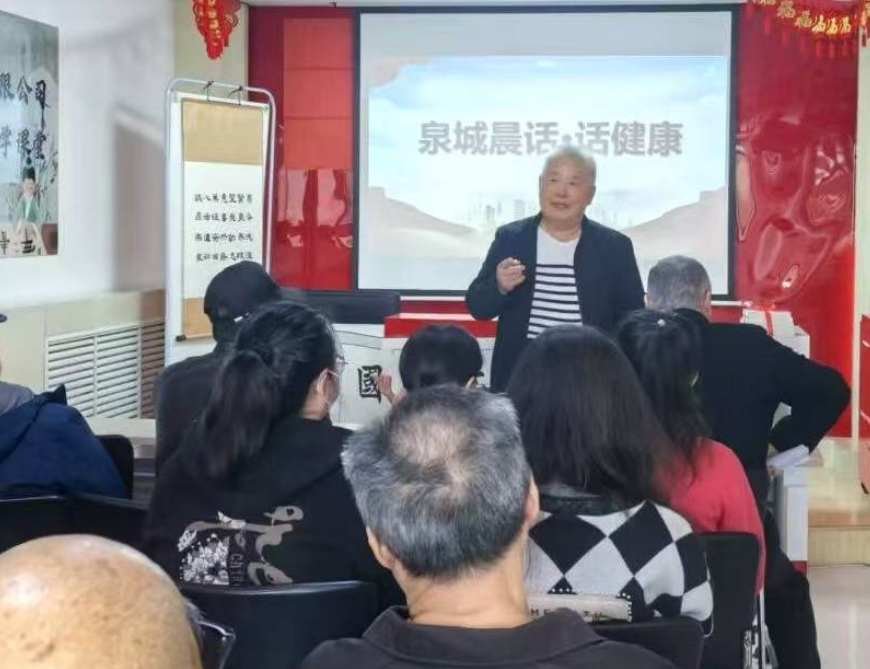 孙秀秀为关爱辖区老年人身心健康,丰富老年群体精神文化生活,11月5日,山东省济南市市中区王官庄街道诚品苑社区举办“泉城晨话·话健康”主题活动,在社区党员臧景亮老师的引荐下,邀请《泉城晨话》作者杨延斌先生亲临现场,为社区老人分享实用养生知识,传递健康生活理念。
