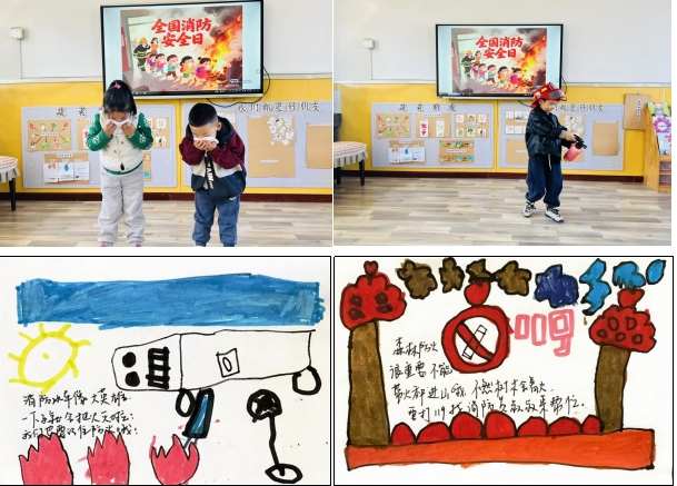 活动首日,消防知识小课堂趣味开讲。老师通过动画、绘本、实物教具,生动讲解火灾危害、消防器材名称及报警电话等基础常识,孩子们踊跃举手互动,将安全知识牢记心间。次日,消防区小游戏热闹上线,“模拟灭火”“寻找安全出口”等沉浸式体验,让幼儿在玩乐中熟悉消防场景,提升应变能力。第三天的消防故事分享会温情满满,老师讲述消防员逆行救援的英勇事迹,孩子们被消防员的责任与担当深深打动,纷纷表达对“最美逆行者”的敬佩。第四、五日聚焦实践演练与成果展示,逃生技能小演练中,孩子们在老师引导下,用湿毛巾捂住口鼻,弯腰低姿快速有序疏散,熟练掌握正确逃生方法。成果展示环节,孩子们精心绘制的消防绘画、亲手制作的疏散路线图布满展厅,每一幅作品都凝聚着对消防安全的理解与重视。