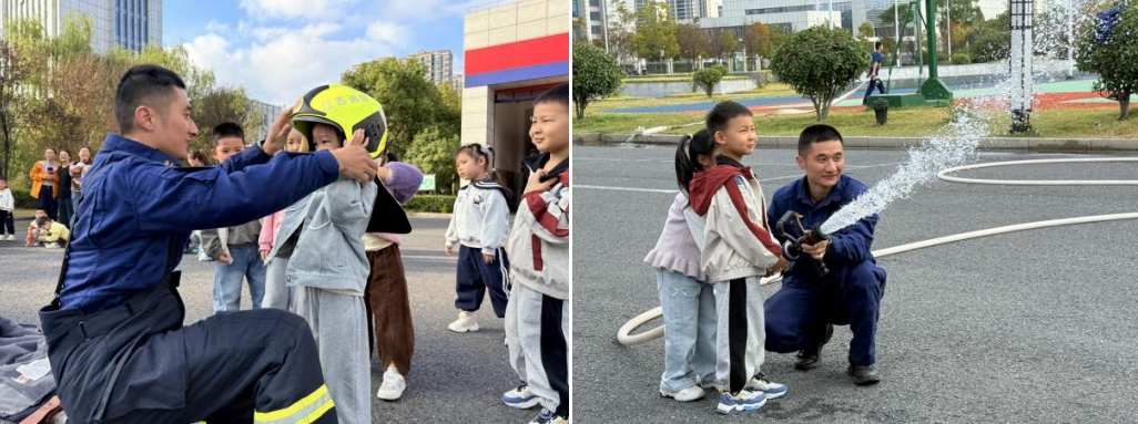 抵达消防大队后,孩子们的探索热情瞬间被点燃。消防车库内,排列整齐的消防车宛如 “钢铁卫士” 格外吸睛。消防员叔叔逐一展示了灭火器、消防水带、破拆工具等专业装备,用童趣化的语言讲解其名称与用途。面对孩子们举手提出的稚嫩问题,消防员叔叔耐心细致地一一回应。最令人期待的水枪灭火演示环节中,部分老师与幼儿在消防员的专业指导下亲身参与,真切感受消防装备的强大威力,体验 “灭火” 的独特乐趣。