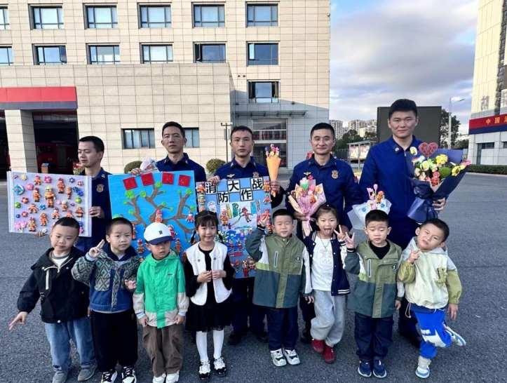 活动尾声,孩子们怀着真挚的敬意,向消防员叔叔送上亲手制作的礼物。纯真的笑脸与 “火焰蓝” 相映成趣,大家纷纷合影留念,定格下这意义非凡的瞬间。
