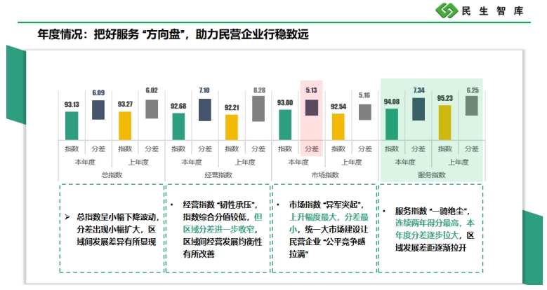 综合指数分析显示,我国民营经济总指数呈小幅下降态势,分差出现小幅扩大,区域间发展差异有所显现。服务指数“一骑绝尘”,连续两年得分最高,本年度分差最大,区域发展差距逐渐拉开。市场指数“异军突起”,上升幅度最大,区域差距进一步缩小,统一大市场建设让民营企业“公平竞争感拉满”。经营指数“韧性承压”,尽管综合得分在各分项各指数不高,但区域分差进一步收窄,区域间经营发展均衡性有所改善。