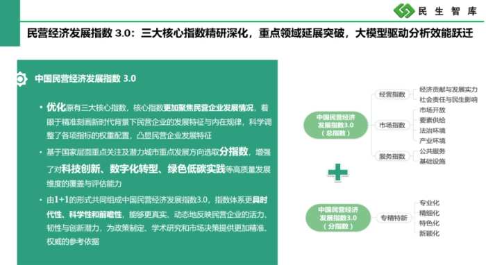由1+1的形式共同组成中国民营经济发展指数3.0,指数体系更具时代性、科学性和前瞻性,能够更真实、动态地反映民营企业的活力、韧性与创新潜力,为政策制定、学术研究和市场决策提供更加精准、权威的参考依据。