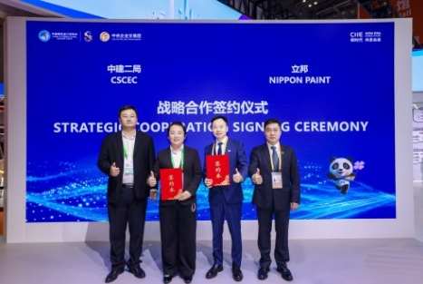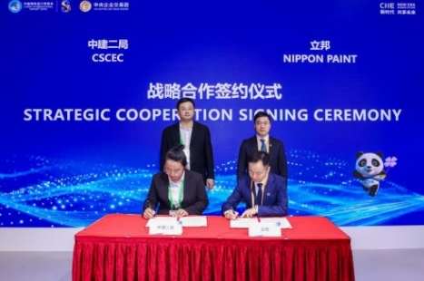 中建二局装饰公司作为进博会中国建筑股份有限公司国资委中央企业交易团成员,与国际知名企业立邦涂料(中国)进行深入交流与合作,签订战略采购协议,共同拓展合作新空间、携手实现共赢发展。