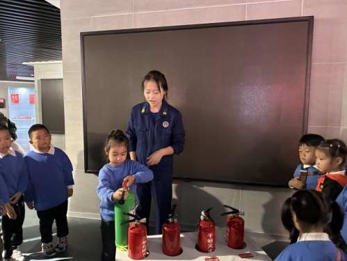 上午 9 时,消防员姐姐的热情接待让孩子们倍感亲切,大家有序走进消防科普教育馆。馆内,消防员姐姐不仅展示了各类救火实景照片,还生动讲述了照片背后惊心动魄的救援故事,孩子们对消防员的敬佩之情油然而生。同时,姐姐细致讲解了常见消防标志的含义,并手把手带领孩子们演示灭火器的正确使用方法,让安全技能深植于心。