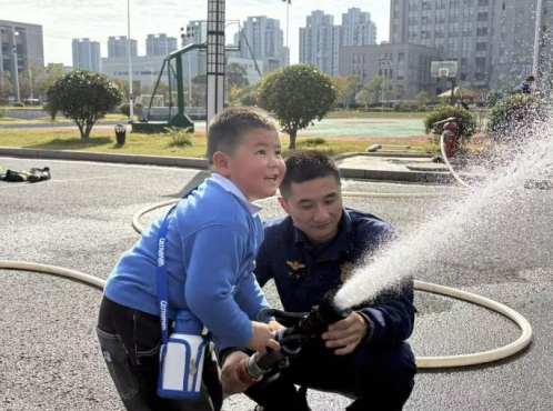 随后,消防员哥哥带领孩子们探秘不同类型的消防车辆。从水罐消防车到云梯消防车,哥哥详细介绍了车辆的构造与核心功能,还特意邀请孩子们走进消防车内亲身体验。现场,孩子们亲手参与 “模拟灭火”,感受高压水枪喷射的威力,亲手触摸厚重的消防服,真切体会到消防员工作的责任与艰辛。