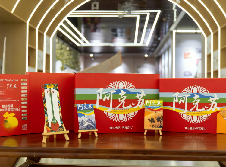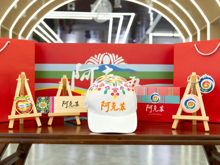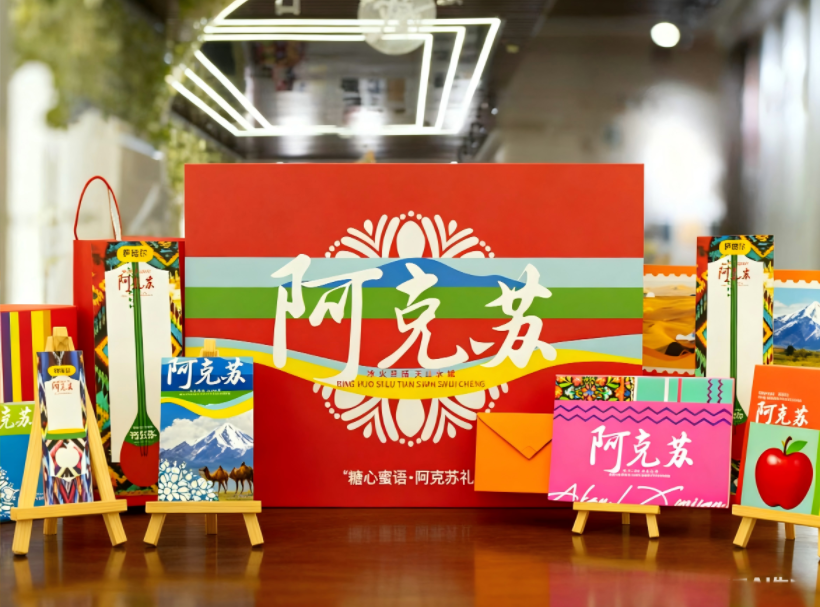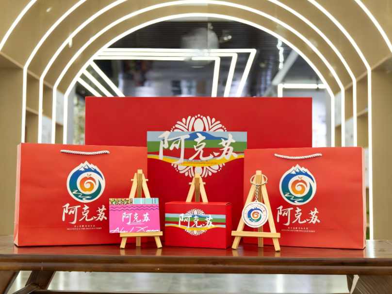 “天山水城・阿克苏礼” 系列文创涵盖三大类 40 余种产品,是铸牢中华民族共同体意识的创新载体。“糖心蜜语・阿克苏礼” 中,苹果造型纸扇融合艾德莱斯绸纹样与丝路元素,金属徽章结合冰糖心苹果与民族乐器,IP 扑克牌融入石窟壁画等符号;“瓷绘新疆・阿克苏礼” 系列中,“民族团结” 主题杯垫用传统艾特莱斯纹样和现代纹样性融合的图案。目前,这些文创将进入各个党群服务中心,通过党员干部宣传成为传递团结故事的 “移动名片”。