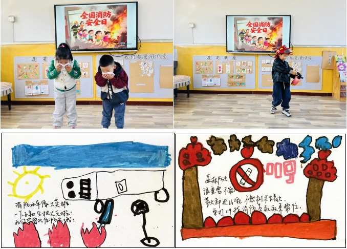 活动首日,消防知识小课堂趣味开讲。老师通过动画、绘本、实物教具,生动讲解火灾危害、消防器材名称及报警电话等基础常识,孩子们踊跃举手互动,将安全知识牢记心间。次日,消防区小游戏热闹上线,“模拟灭火”“寻找安全出口”等沉浸式体验,让幼儿在玩乐中熟悉消防场景,提升应变能力。第三天的消防故事分享会温情满满,老师讲述消防员逆行救援的英勇事迹,孩子们被消防员的责任与担当深深打动,纷纷表达对“最美逆行者”的敬佩。第四、五日聚焦实践演练与成果展示,逃生技能小演练中,孩子们在老师引导下,用湿毛巾捂住口鼻,弯腰低姿快速有序疏散,熟练掌握正确逃生方法。成果展示环节,孩子们精心绘制的消防绘画、亲手制作的疏散路线图布满展厅,每一幅作品都凝聚着对消防安全的理解与重视。