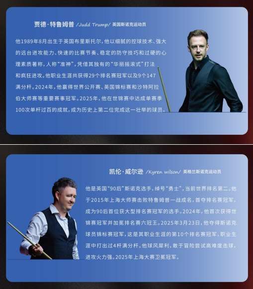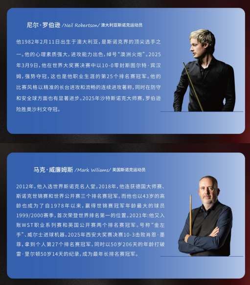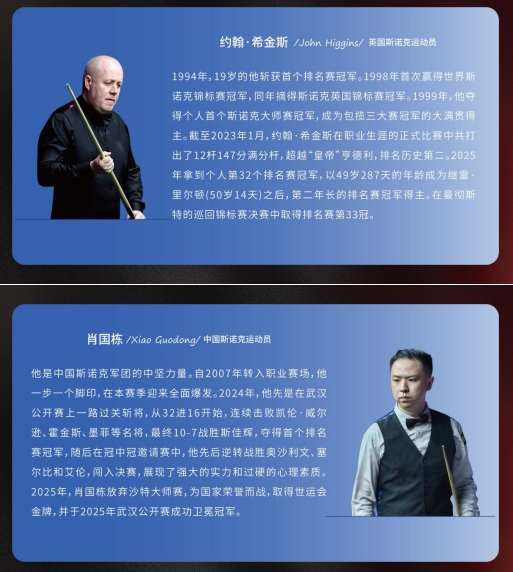 其中,希金斯的老练控球与肖国栋的本土主场迎战、特鲁姆普的精准远台进攻与罗伯逊的犀利攻势等焦点场次,将为球迷带来极致观赛体验,让赛事从一开始就具备“世界级水准、本土化温度”的独特魅力。