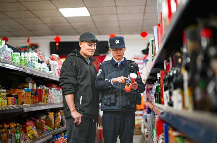 图为民警正在检查商铺食品安全保质期情况。刘楠 摄