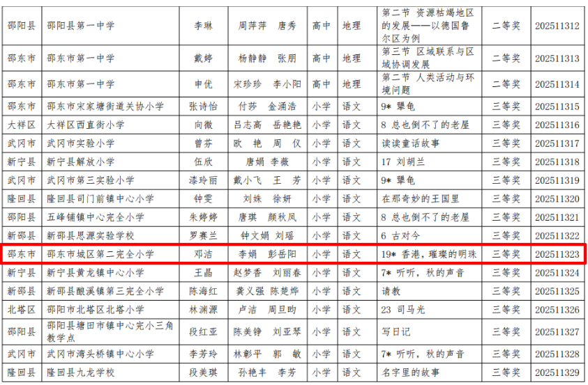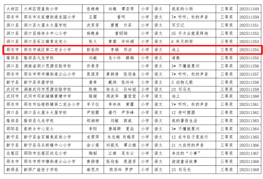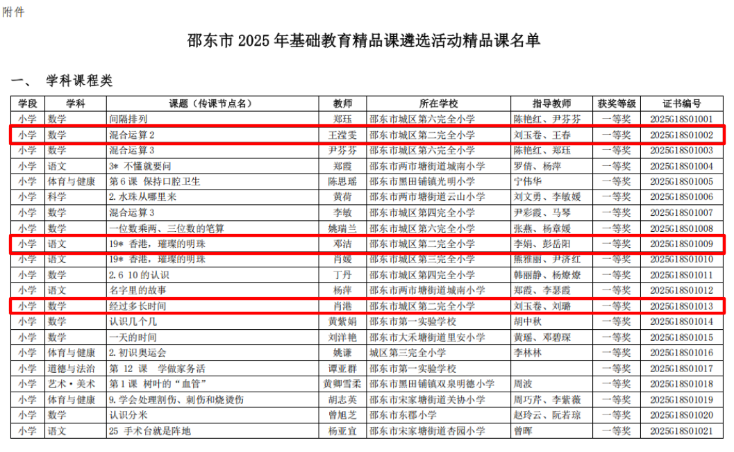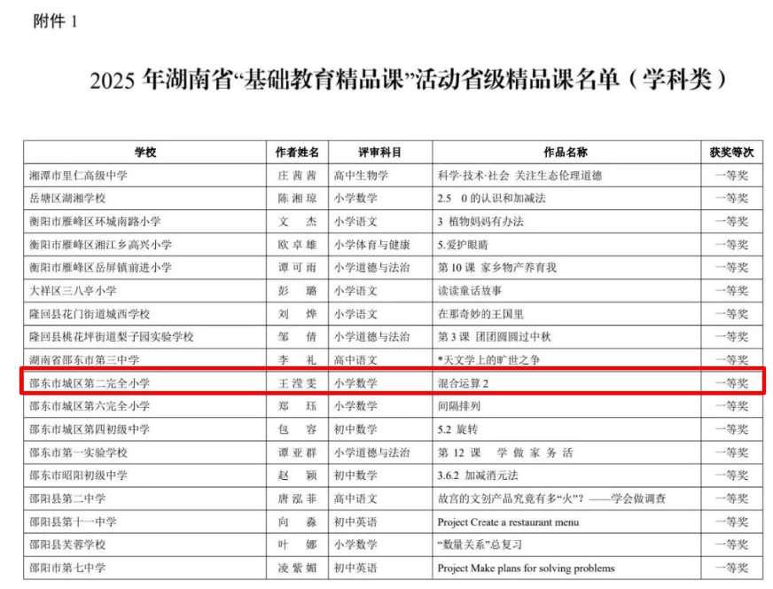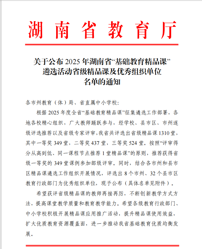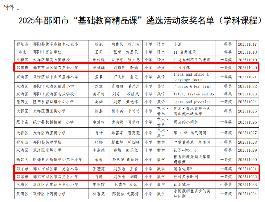 本网湖南讯(通讯员 吴杭瑀 张小玲)近日,2025年湖南省、邵阳市及邵东市“基础教育精品课”遴选结果相继揭晓!邵东市城区第二完全小学的老师们凭借扎实的教学功底与创新的课堂设计,在层层严苛评选中脱颖而出,揽获省、市、县三级多项荣誉,用实力书写教育荣光,特此向全体师生、家长及社会各界报喜!