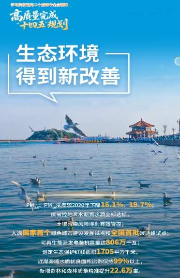 五年来,坚定不移走生态优先、绿色发展之路,美丽青岛的颜值更靓。污染防治加力提效。PM2.5、PM10浓度较2020年下降16.1%、19.7%,国省控地表水断面水质全部达标,土壤污染风险得到有效管控,市民切身感受到青岛的天更蓝、水更清、环境更优美。绿色转型步伐不断加快。入选国家首个绿色城市建设发展试点和全国首批碳达峰试点,可再生能源发电装机容量达806万千瓦,是2020年的3.3倍,绿色已经成为高质量发展的鲜明底色。生态修复成效明显。划定生态保护红线面积1705平方千米,近岸海域水质优良面积比例保持99%以上,新增造林和森林质量精准提升22.6万亩。