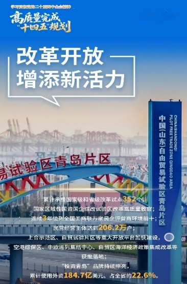 五年来,坚持用好改革开放“关键一招”,持续优化发展环境,经济社会发展的内生动力更足。改革动能加速释放。累计承接国家级和省级改革试点352个,国家区域性国资国企综改试验区改革高质量收官,连续3年位列全国工商联万家民企评营商环境前十。民营经营主体达到206.2万户,较“十三五”末新增近30万户。开放能级显著提升。国家赋予青岛北方对外开放门户定位,上合示范区、自贸试验片区等重大开放平台加快建设,空港综保区、中欧班列集结中心、自贸区海洋经济政策集成改革等获批落地。“投资青岛”品牌持续擦亮,益海嘉里、阿斯利康等世界500强企业增资扩产,累计使用外资184.7亿美元、占全省的22.6%。跨国公司领导人青岛峰会、海洋合作发展论坛等重大活动成为高水平开放的重要平台,城市国际影响力持续增强。