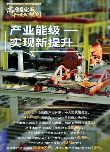 五年来,坚持把发展经济的着力点放在实体经济上,“10+1”创新型产业体系、十大现代服务业、“4+4+2”现代海洋产业体系建设加快起势。工业基础更加坚实。芯恩、京东方、歌尔、海尔卡奥斯、奇瑞等龙头企业的一批引领性项目实现突破,智能家电、轨道交通装备、船舶与海洋工程装备、仪器仪表4个集群入选国家先进制造业集群、居副省级城市第2位,高技术制造业增加值年均增长15.9%,全国先进制造业百强市排名从2020年的第11位跃升至2024年的第6位。服务业作用更加凸显。服务业增加值突破万亿元大关,年均增长6.5%,占生产总值的比重保持在63%左右,对经济增长的贡献率平均每年65%左右,成为拉动经济增长的主引擎。深入推进现代服务业和先进制造业融合发展,国家级“两业融合”试点数量居全国城市首位,获批服务业扩大开放综合试点城市。海洋经济特色更加彰显。海洋生产总值突破5500亿元、居全国沿海城市第三位,占地区生产总值比重达到33%。“深海一号”“海葵一号”等“大国重器”交付运营。青岛港货物、集装箱吞吐量跃升到全球第4和第5位,在新华·波罗的海国际航运中心发展指数中排名跃居全球第13位,集装箱海铁联运量连续10年保持全国首位。