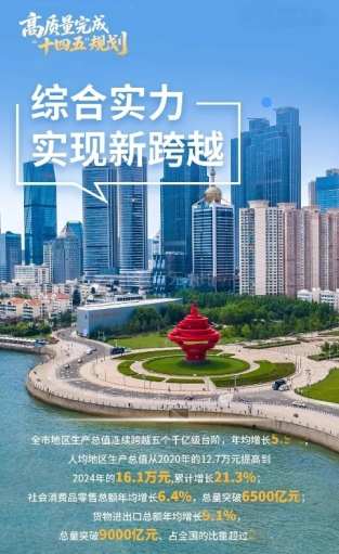 五年来,始终把高质量发展作为首要任务,以青岛的稳与进为全国全省大局多作贡献。从经济总量看,全市地区生产总值连续跨越五个千亿级台阶,预计今年将突破1.7万亿元,年均增长5.9%,增速居同类城市前列。2024年,全员劳动生产率达到31.1万元/人,年均增长6.4%,明显高于生产总值年均增速。从人均水平看,人均地区生产总值从2020年的12.7万元提高到2024年的16.1万元,累计增长21.3%,按美元计算达到2.3万美元。从重点领域看,社会消费品零售总额年均增长6.4%,总量突破6500亿元,在北方城市中仅次于北京。货物进出口总额年均增长9.1%,总量突破9000亿元、占全国的比重超过2%。