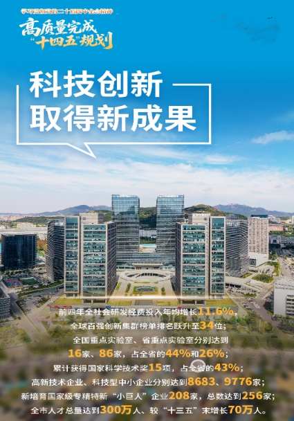 五年来,把科技创新摆在发展全局的核心位置,大力推进科技强市建设,前四年全社会研发经费投入年均增长11.6%,全球百强创新集群榜单排名从2020年的第69位跃升至2025年的34位。创新平台建设实现突破。崂山实验室获批设立并规范化运行,高端智能化家电、虚拟现实2个国家级制造业创新中心获批建设。全国重点实验室、省重点实验室分别达到16家、86家,占全省的44%和26%。重大科技成果加速涌现。累计获得国家科学技术奖15项,占全省的43%。全国首套6000米级深海观测浮标研发成功,时速400公里的新一代动车组样车下线,全球首款8K全色激光电视产品正式发布,这些“首套”“首款”彰显了青岛科技创新的硬实力。企业创新能力显著增强。高新技术企业、科技型中小企业分别达到8683、9776家,是“十三五”末的1.98倍和1.85倍。新培育国家级专精特新“小巨人”企业208家,总数达到256家。科技成果转化提速提效。推出成果转化10项举措,钙钛矿太阳能电池、硫化物固态电池、合成生物等技术成果加速转化落地,2024年技术合同交易额较2020年增长147%。尤其值得一提的是,人才加快向青岛集聚,全市人才总量达到300万人、较“十三五”末增长70万人,近日公布的2025年院士增选当选院士名单中,全省新增8位院士,其中6位来自青岛。创新资源的集聚和能力的提升,增添了我们推动高质量发展的信心和底气。