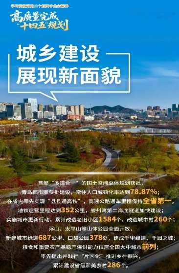 五年来,深入践行人民城市理念,统筹推进乡村振兴和新型城镇化建设,首部“多规合一”的国土空间总体规划获批,青岛在全国的功能定位实现重大突破,青岛都市圈获批建设,常住人口城镇化率达到78.87%。基础设施更加完善。外联内畅的现代化基础设施网络基本形成,胶东国际机场转场运营,在省内率先实现“县县通高铁”,高速公路通车里程保持全省第一,地铁运营里程达到352公里、较“十三五”末增加106公里,胶州湾第二海底隧道加快建设。城市品质全面提升。实施城市更新行动,累计改造老旧小区1584个,惠及居民约48万户,改造城中村260个,6.1万户居民顺利回迁。浮山、太平山等山体公园全面开放,新建城市绿道687公里、口袋公园378处,新建改造全民健身设施24处,建成千里绿道、千园之城。乡村振兴成果丰硕。粮食和重要农产品稳产保供能力位居全国大中城市前列,粮食年产量保持在310万吨以上,率先提出并践行“片区化”推进乡村振兴,累计建设省级和美乡村286个,城乡居民收入比由2020年的2.36缩小至2.18。