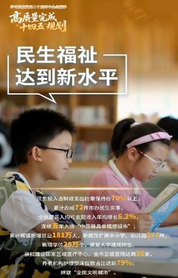 五年来,始终践行以人民为中心的发展思想,民生投入占财政支出比重保持在70%以上,累计办成72件市办民生实事,全体居民人均可支配收入年均增长6.2%,与经济增长基本同步,连续五年入选“中国最具幸福感城市”。公共服务更加优质均衡。累计城镇新增就业181万人,新建改扩建中小学、幼儿园277所,新增学位25万个,康复大学建成招生。获批建设国家区域医疗中心,全市三级医院达到35家,养老机构护理型床位数占比达到79%,人均预期寿命提高到82.21岁。文明城市品牌持续擦亮。蝉联“全国文明城市”,国家海洋考古博物馆即将封顶,海军博物馆、市科技馆新馆、市博物馆改扩建等完工投用,历史城区、崂山入选中国世界文化遗产预备名单。