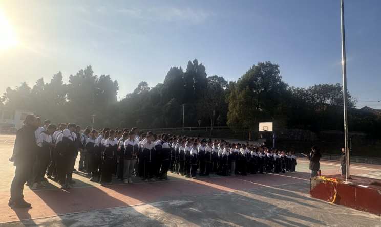 本网湖南讯(通讯员 邓星琼 段粤玲)清晨的阳光裹着初冬的凉意,洒遍湖南省武冈市邓元泰镇江塘九年制学校的操场——列队的师生们校服笔挺,胸前的红领巾在微风里轻扬,目光齐刷刷凝向旗杆顶端。集合哨音刚落,主持人清亮的声音便撞进耳中:“全体肃立!第38个世界艾滋病日主题升旗仪式,现在开始!”