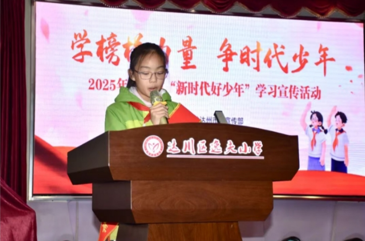 达川区逸夫小学“新时代好少年”陈玢言同学登台,以同龄视角、清澈嗓音分享成长历程。她从身边小事做起,恪守本分、提升自我、孝敬长辈、友爱同学、热心公益,用“坚持做好每一件正确的小事”诠释“少年强则国强”。其故事虽无惊天壮举,却如涓涓细流,展现了新时代青少年向上向善、乐于奉献的风貌,让同学们倍感共鸣。